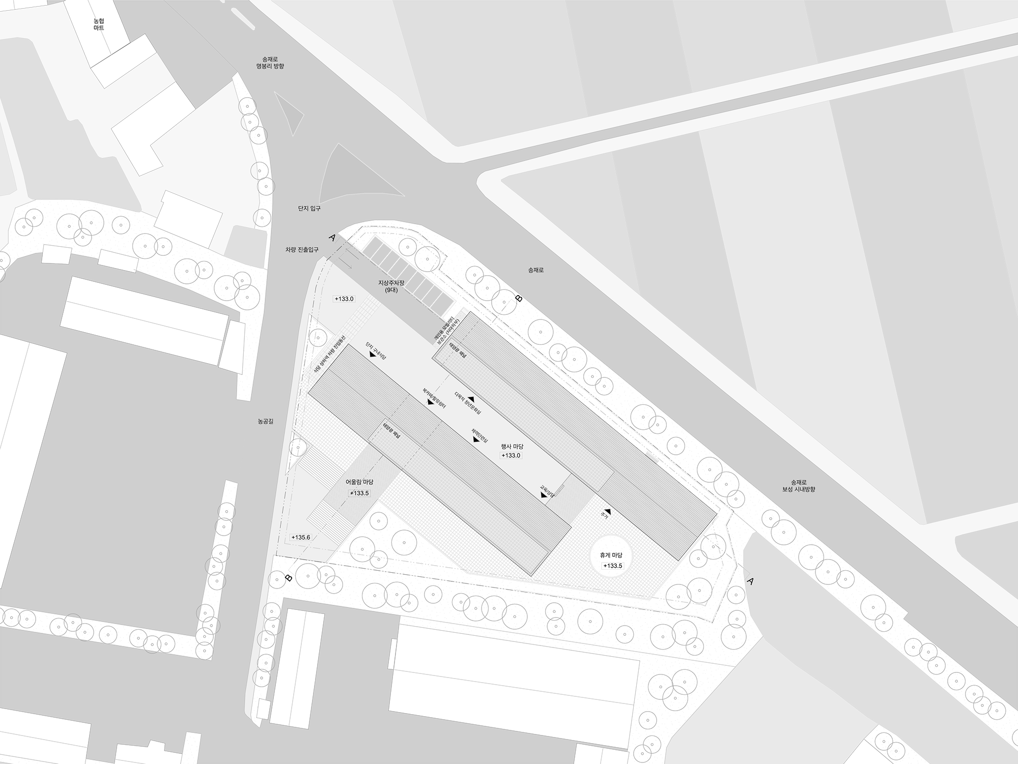 the urban form and way of life embodied in the simple geometry and straightforward layout of the miryeok agro-industrial complex establish the ‘miryeok youth granary’ as its emblematic space, while binding it closely to the fabric of the complex. the rational composition of volumes is not only environmentally responsible and energy-efficient but also fosters a sustainable community. the low eaves and elevated wooden floors characteristic of the complex’s predominant ‘granary-type’ architecture respond sensitively to the subdued surrounding landscape while ensuring generous usability at its core. the hall-like interior generates a spatial continuum capable of flexible adaptation for future programs. an external passageway arranged perpendicular to the two linear volumes interweaves multiple functions—such as a book café and a healing retreat—creating a rich network of connections and a layered architectural landscape.